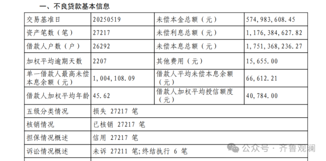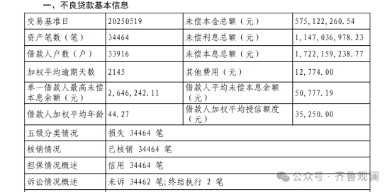 该期不良资产主要来源于京津地区,共涉及借款人户数33916户,借款人平均未偿本息余额5.08万元,借款人加权平均年龄为44.3岁。该期包括资产笔数34464笔,全部为信用贷款,加权平均逾期天数已达2145天。其中,已损失34464笔,已核销34464笔;未诉34462笔,终结执行2笔。
