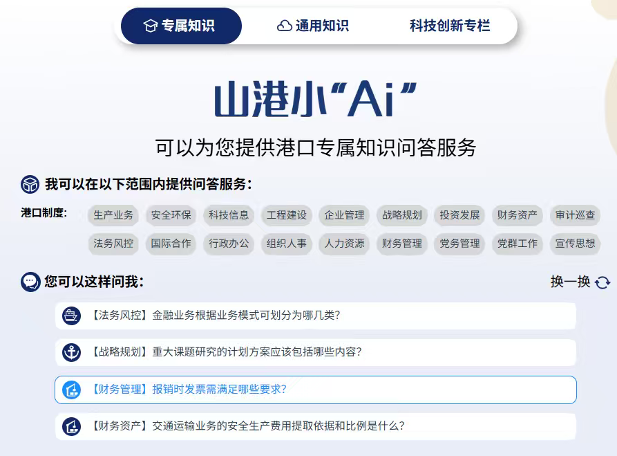 在港口经营管理方面,山东港口为员工量身打造了大模型助手——山港小“Ai”。这位“智能助手”不仅精通海量行业专业知识,还能一键掌握港口生产经营的关键指标和合同管控风险,真正做到“一问知全局”。而对于财务人员,专属会话数字人的出现,则像是一位贴心的助手,它能快速解答问题,减轻人工压力,提升服务质量,让繁琐的工作变得轻松自如。